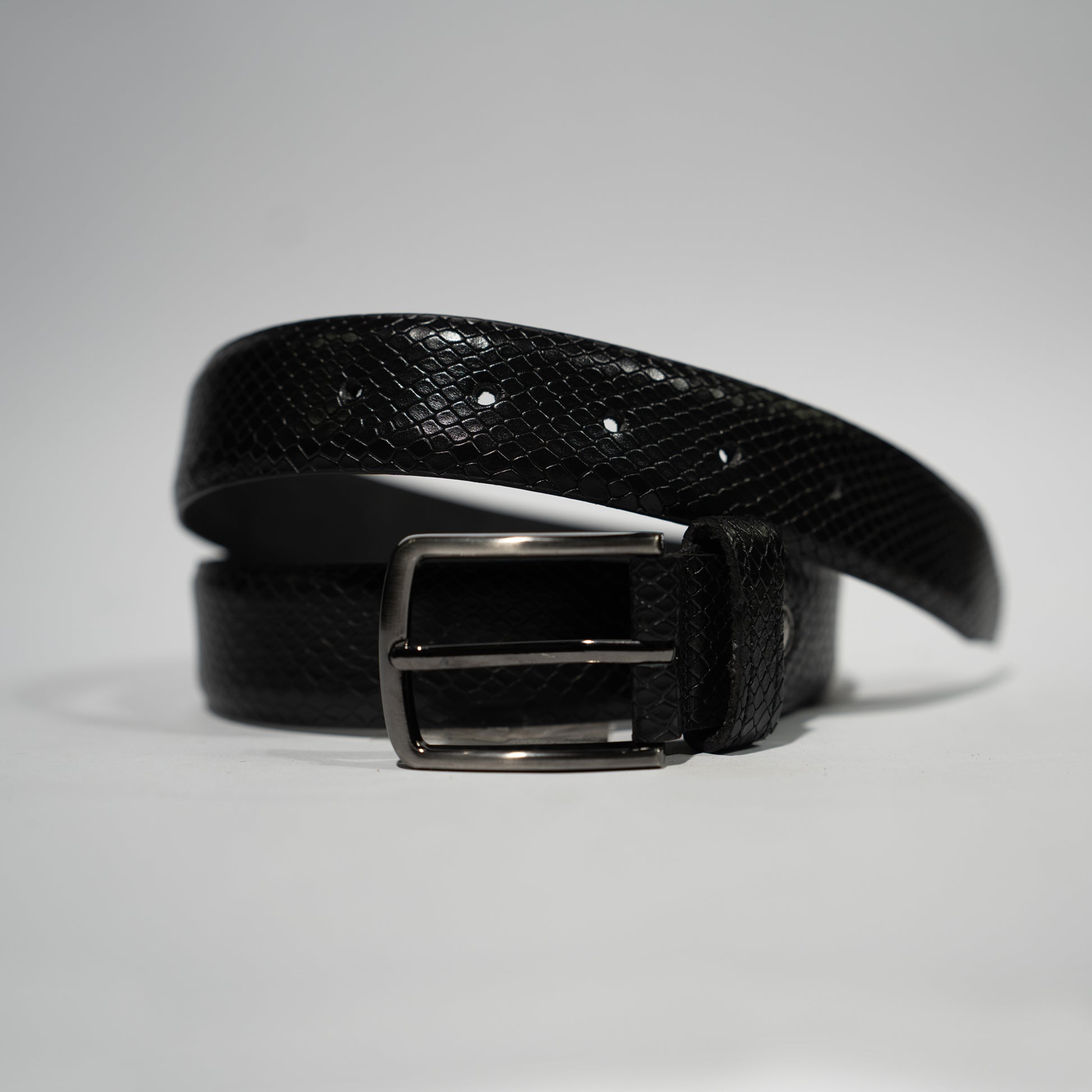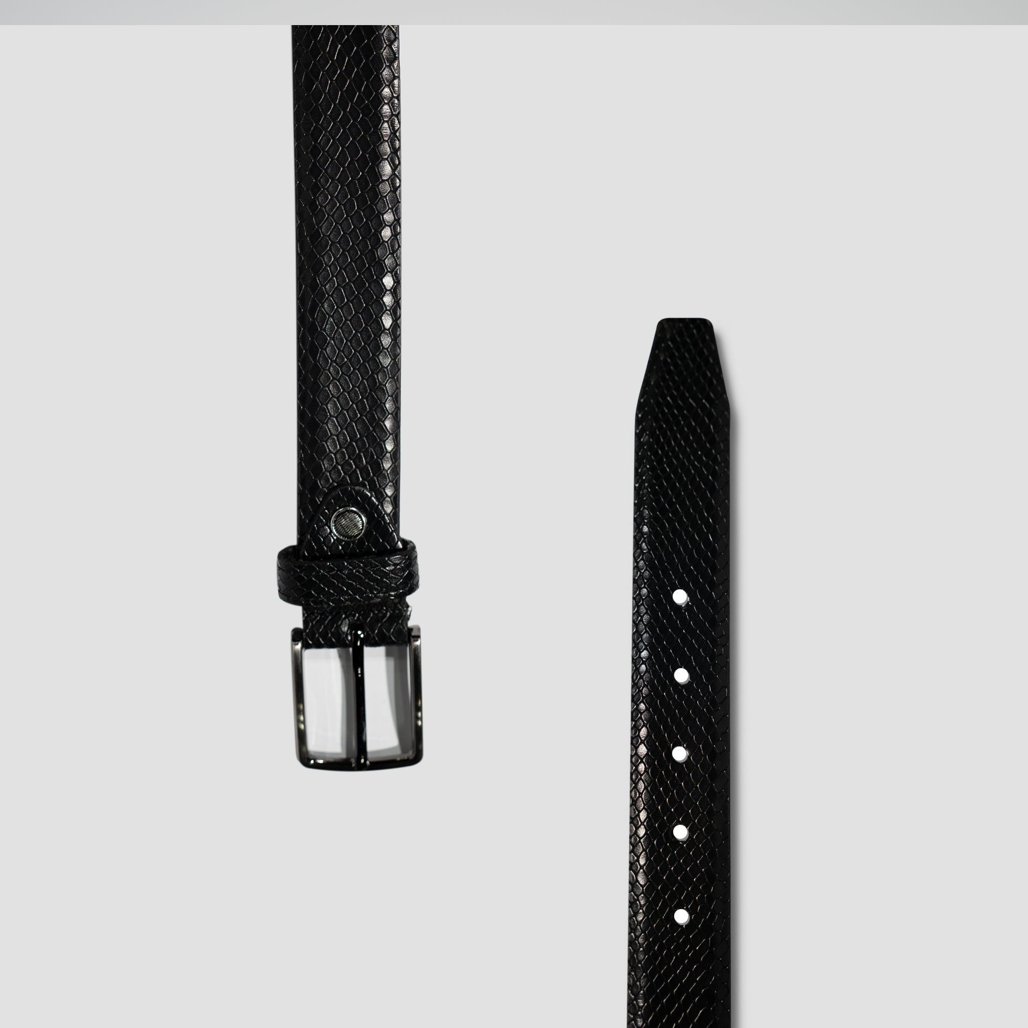 Elevate your style with this black genuine leather belt, designed with a snake skin textured finish for a bold and modern look.