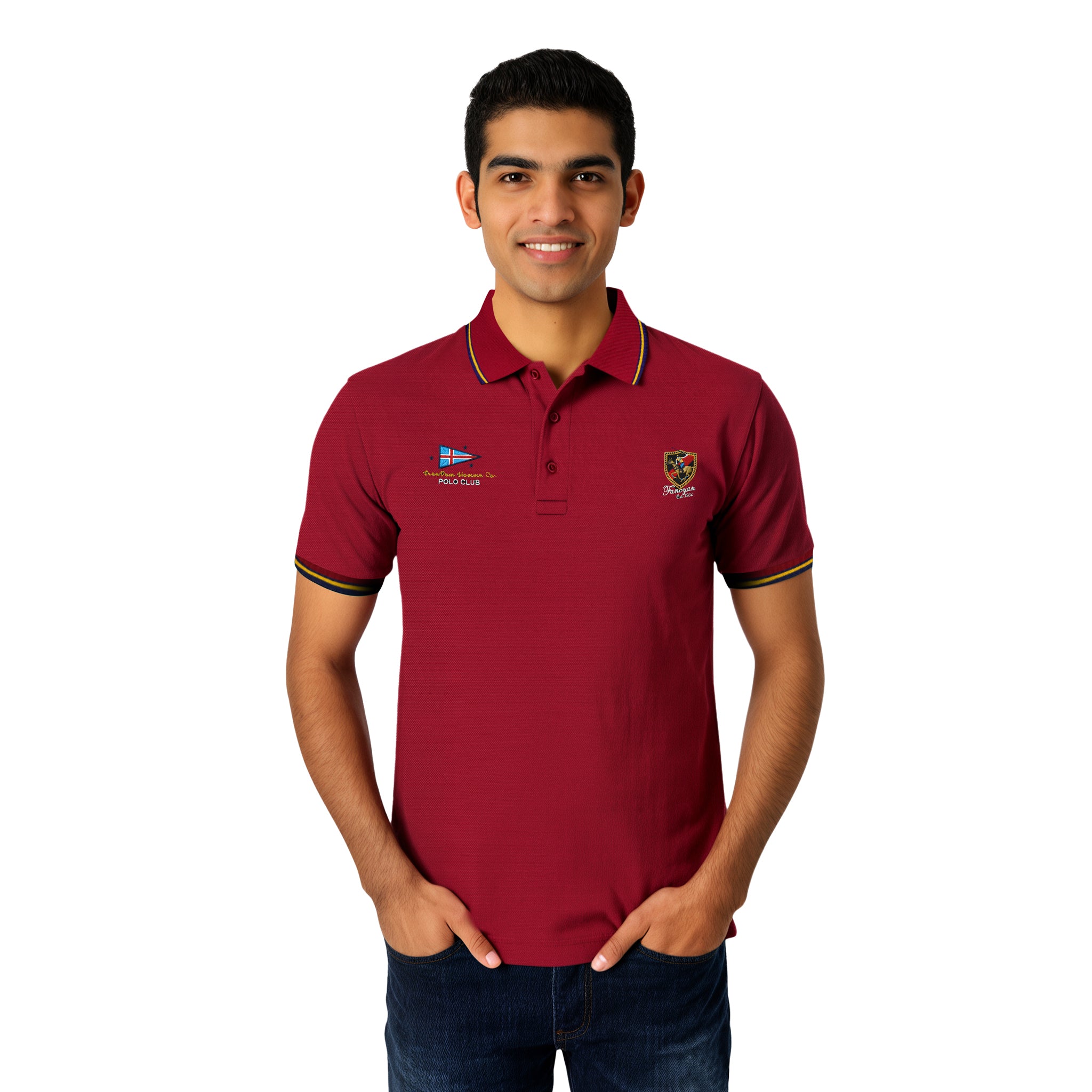 This maroon polo shirt blends classic elegance with sporty detailing. Featuring an embroidered crest and flag logo on the chest, it is finished with fine yellow piping on the collar and sleeves for a sharp contrast.