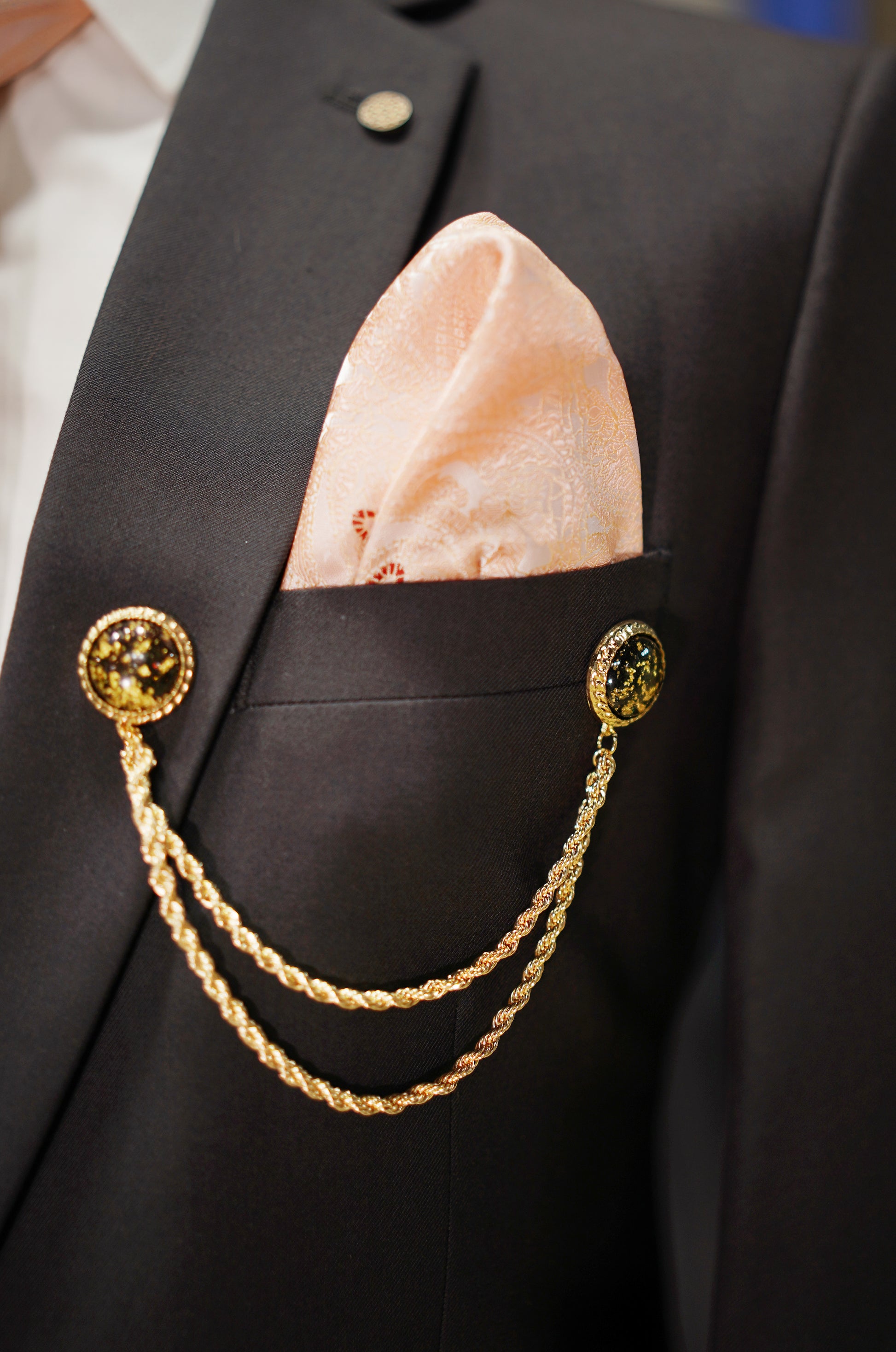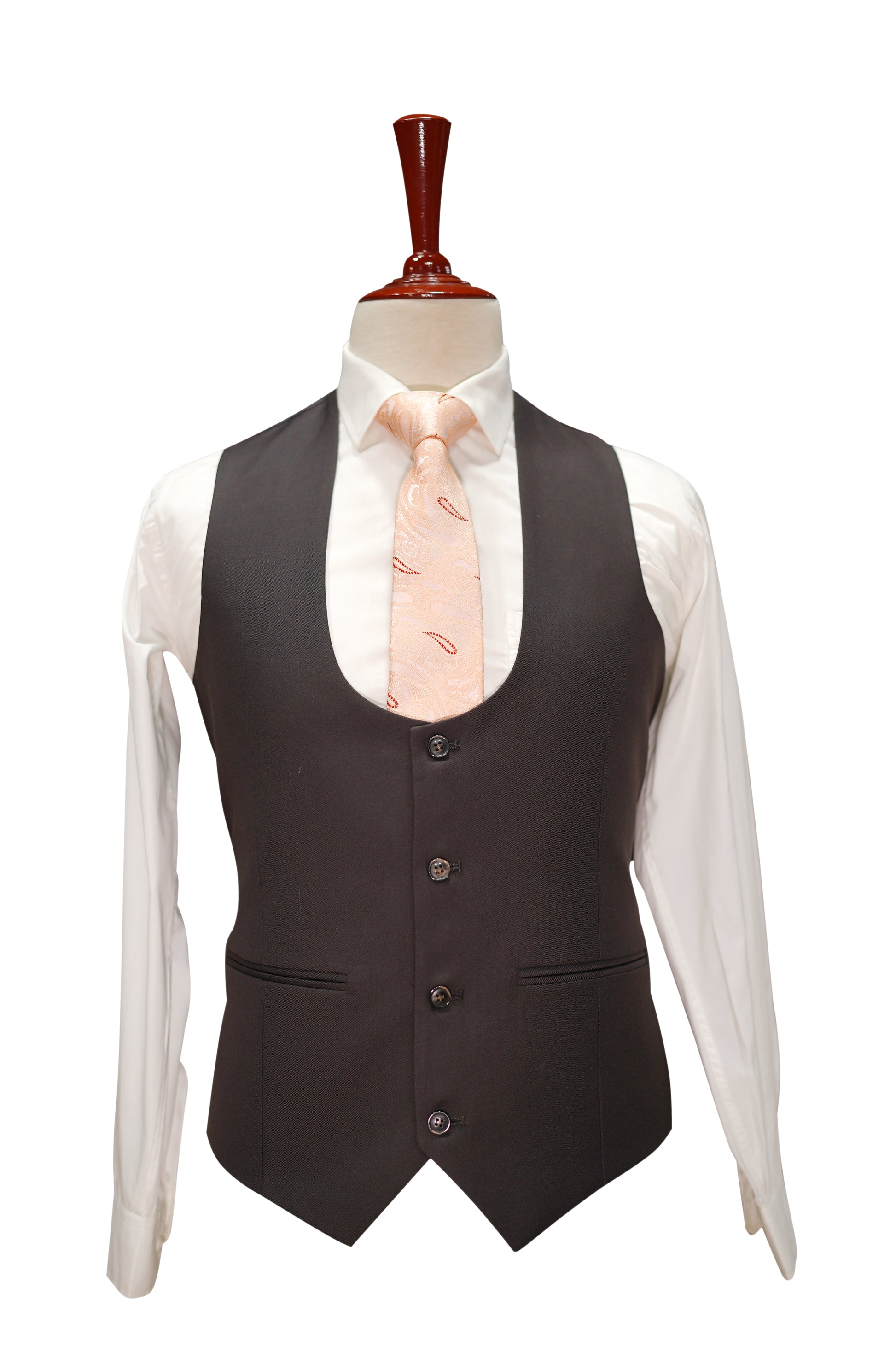 Classic Design: Dark charcoal suit paired with a white shirt, peach tie, and matching pocket square.