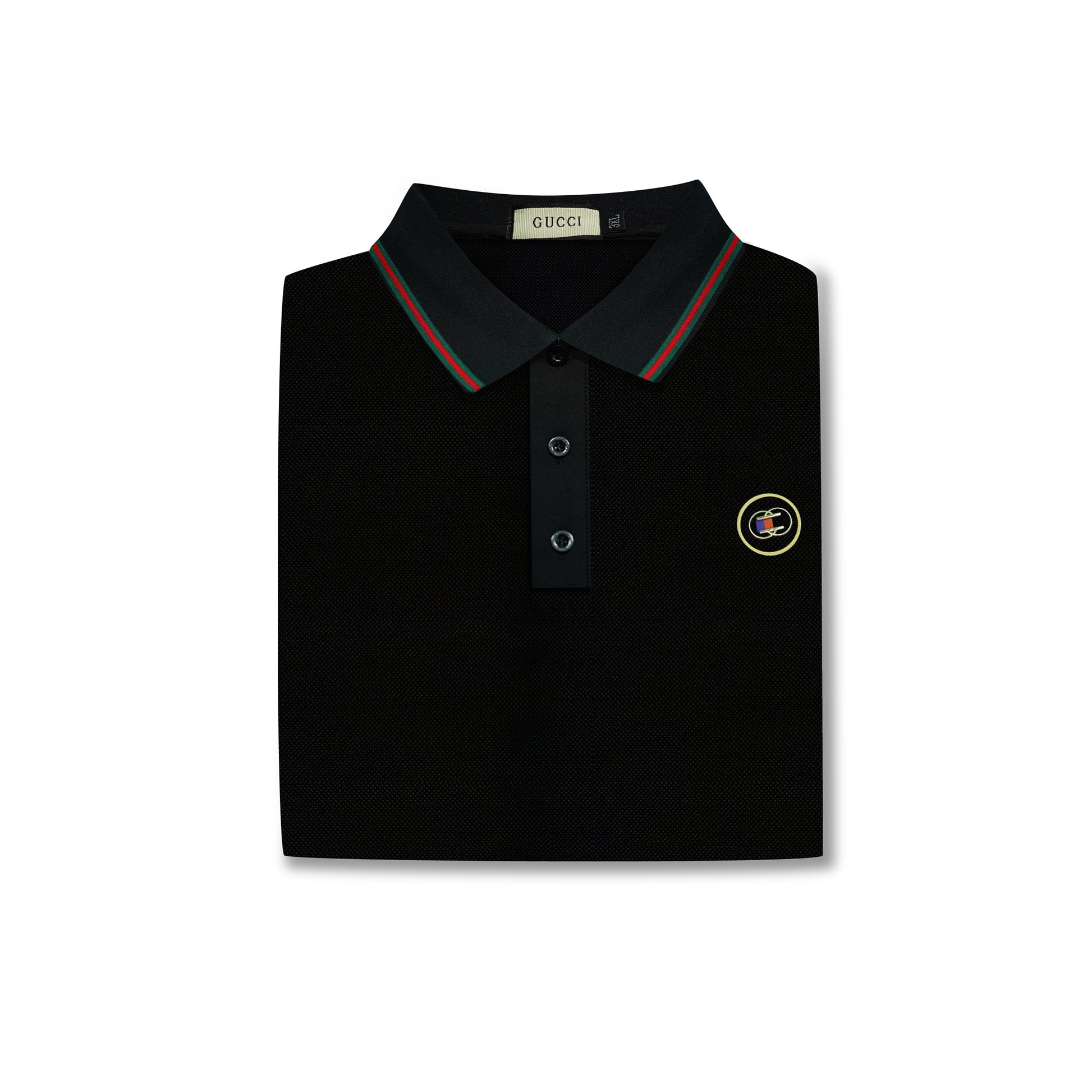 Keep it classy with this black polo t-shirt featuring a subtle round embroidered badge on the chest. Designed with green and red stripe detailing on the collar and sleeve edges, it adds a touch of elegance to a timeless look.