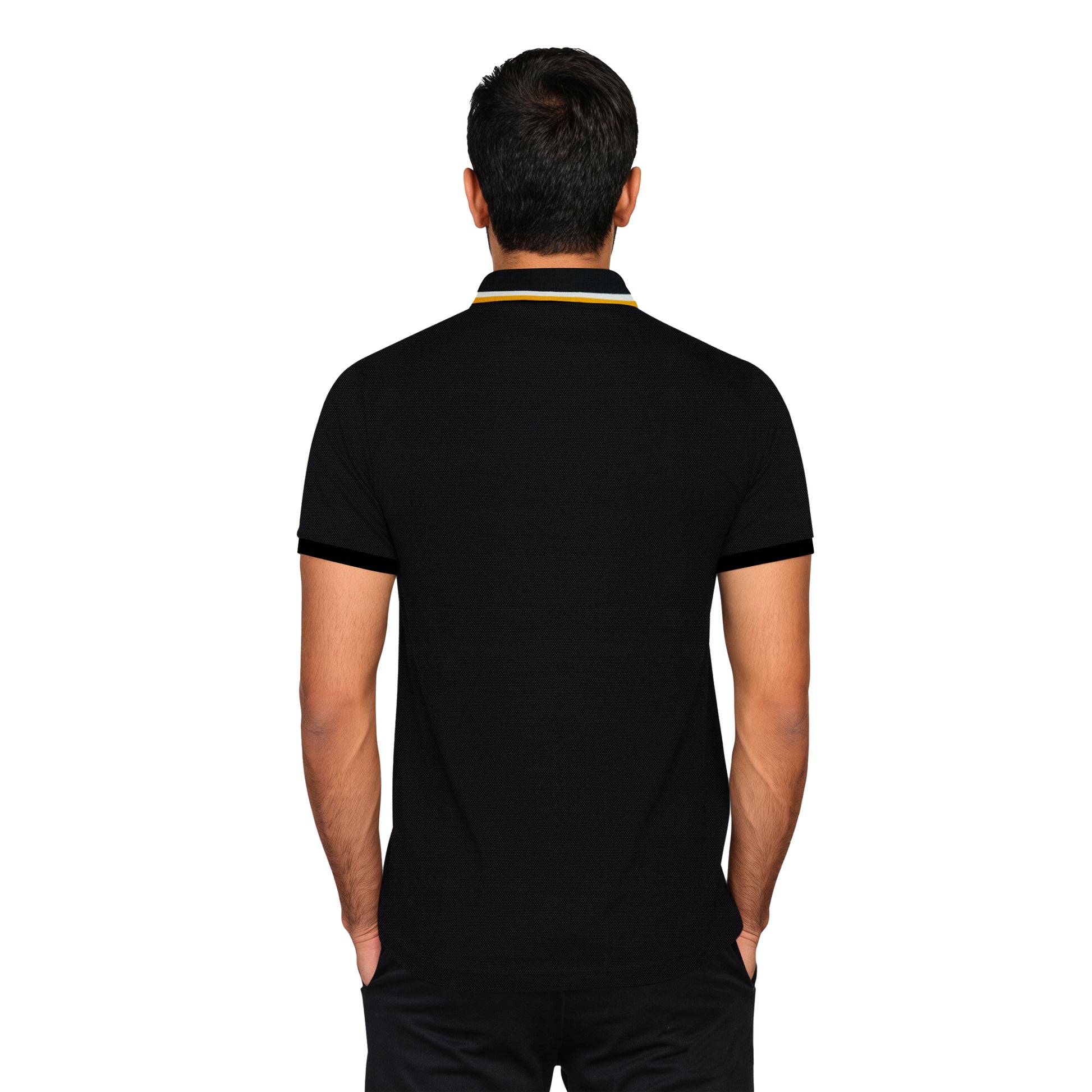 Stand out with this black polo shirt featuring a bold yellow embroidered polo logo and crest on the chest. The yellow-striped collar and sleeve edges create a strong contrast, giving it a sharp and sporty style. Made from a soft cotton blend fabric, it offers breathable comfort, durable stitching, and a smart fit for all-day wear. Perfect for casual outings, semi-formal looks, or pairing with jeans and chinos for a modern versatile outfit.