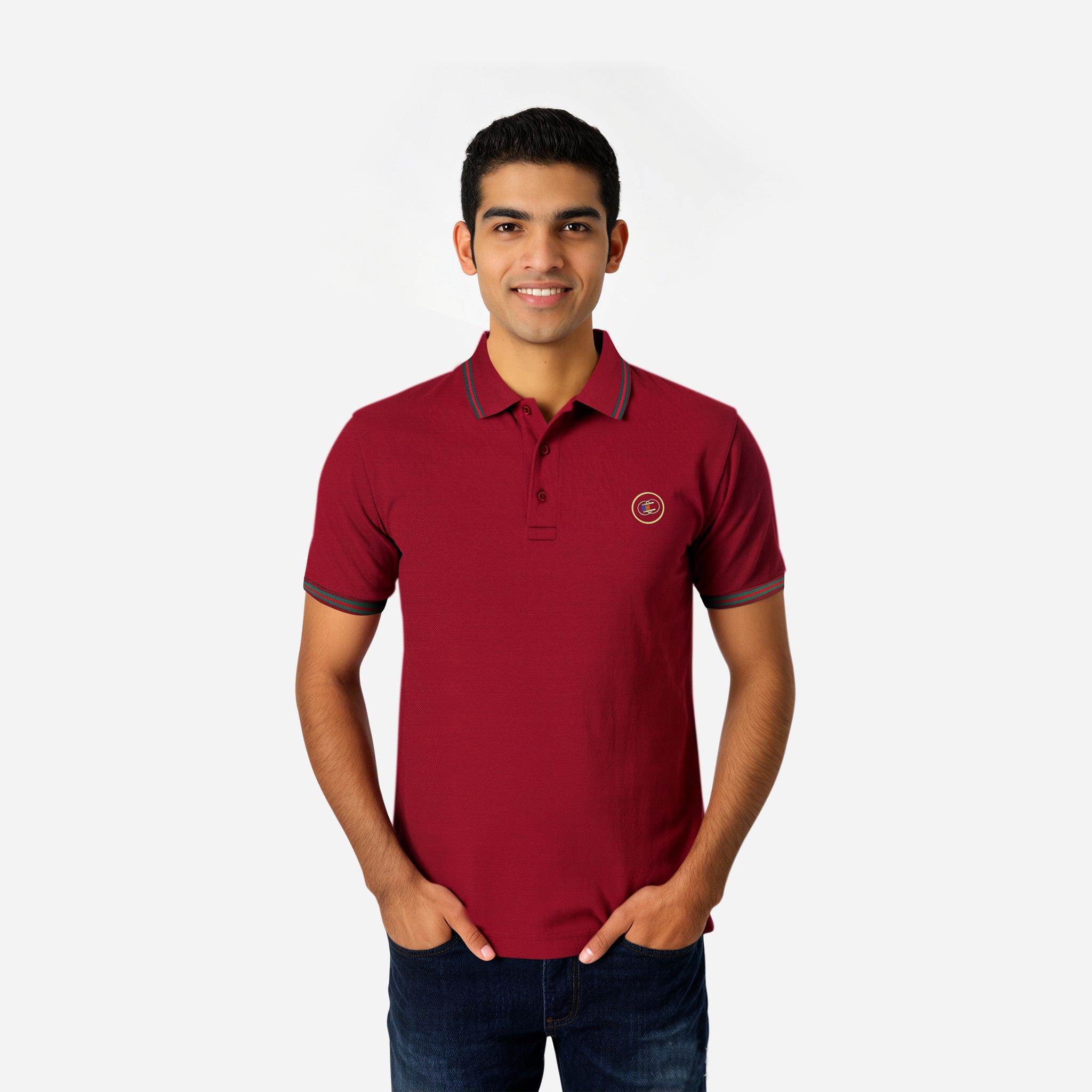 Step up your casual style with this maroon polo shirt featuring a small embroidered badge on the chest. The collar and sleeve edges are detailed with subtle stripe accents, giving it a clean and modern finish.