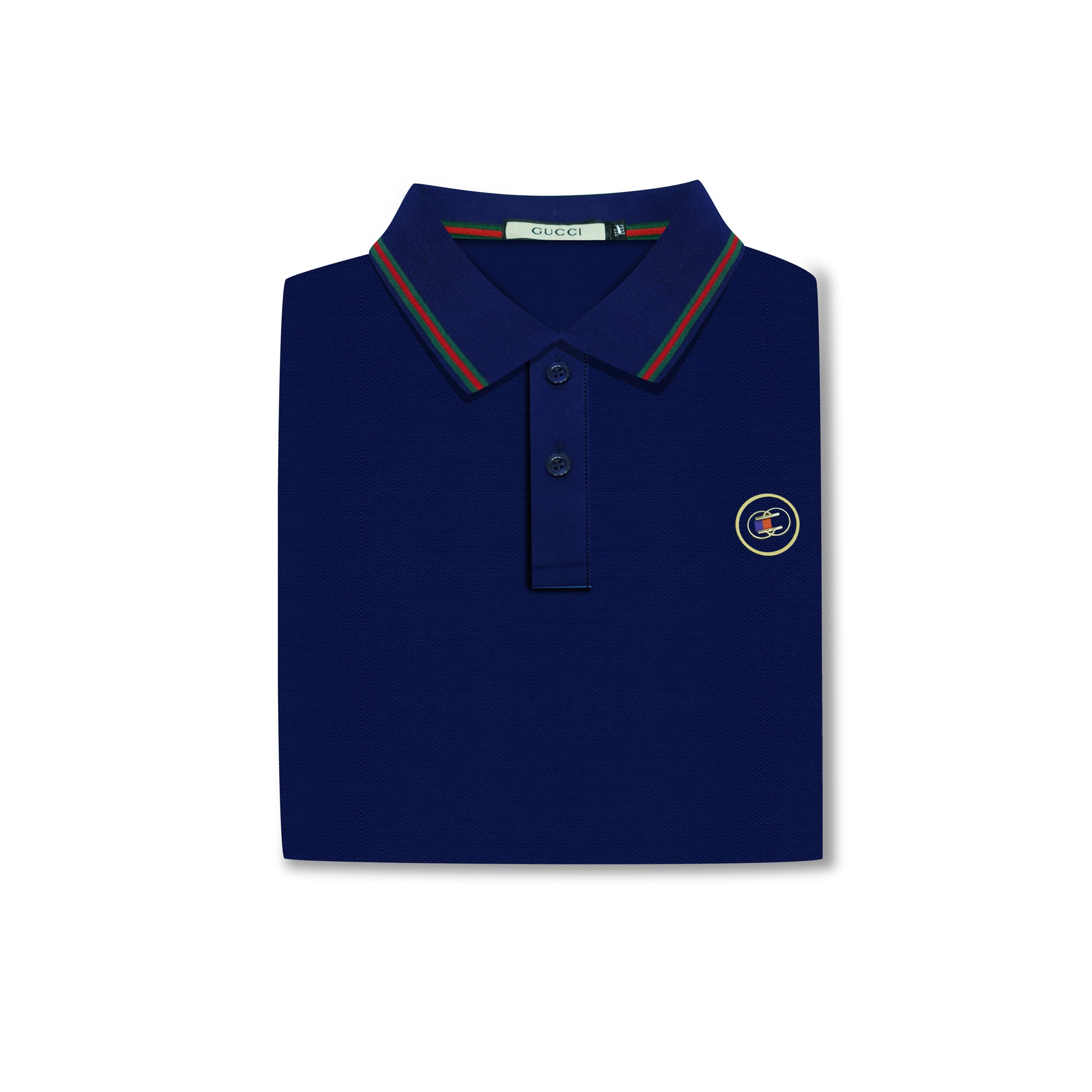 Refresh your wardrobe with this navy blue polo shirt, designed with a small embroidered round badge on the chest. The green and red stripe accents on the collar and sleeves give it a fashionable edge while keeping a classic polo style.