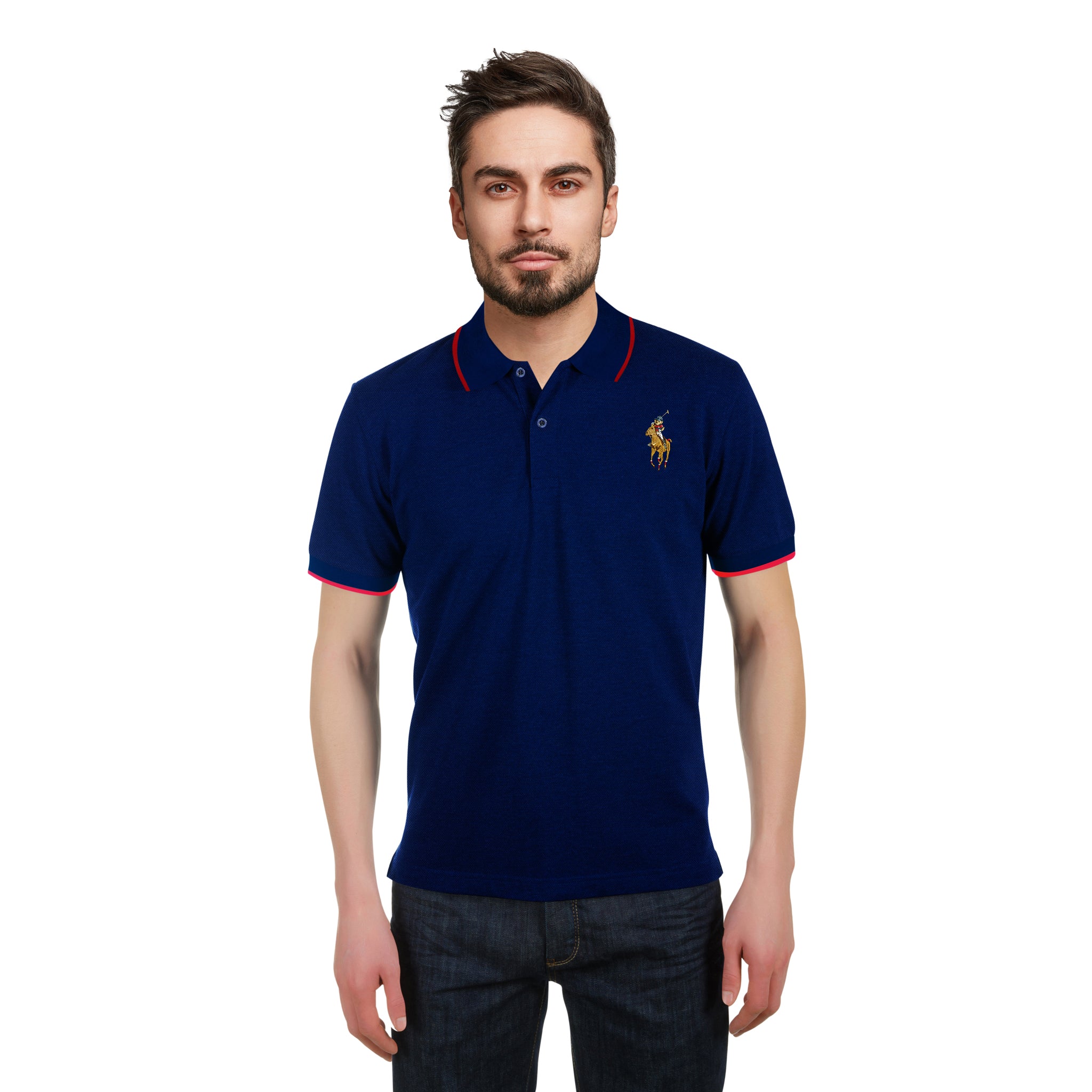 Elevate your wardrobe with this navy blue polo t-shirt featuring a bold embroidered polo horse logo on the chest. The design is enhanced with fine red piping on the collar and sleeve edges, adding a modern stylish touch.